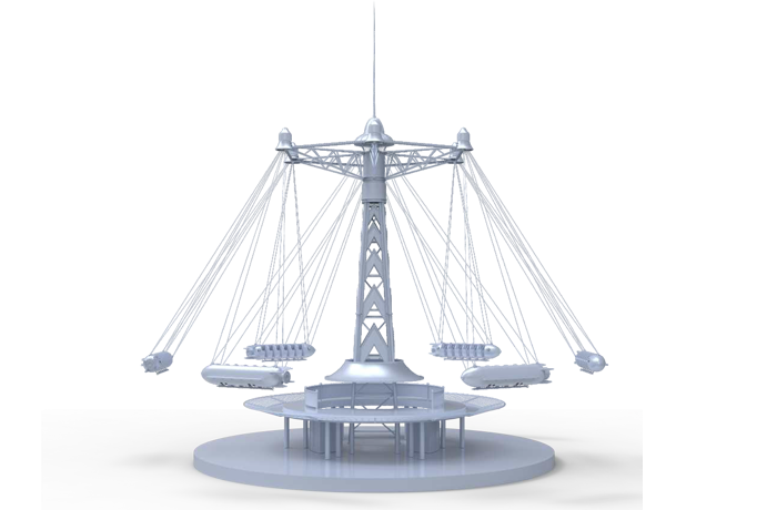 幻速追影六個飛機(jī)吊掛座艙隨同旋轉(zhuǎn)架相對塔體自由旋轉(zhuǎn)并外擺升起,繞中心立柱飛行,科幻又刺激。夜間智能燈光系統(tǒng)亮起,成為樂園一道的奇趣風(fēng)景線。